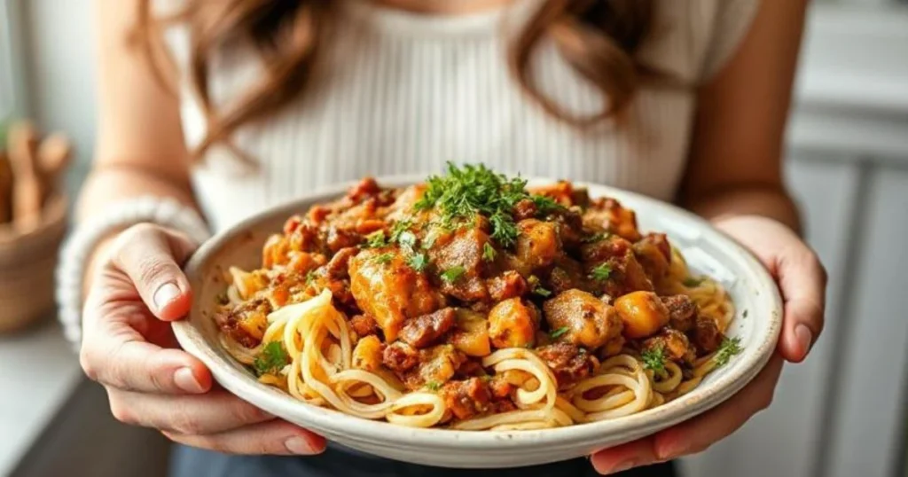 Heaping serving of Italian pasta with vibrant tomato sauce, illustrating a quick and flavorful Dump and Bake recipes.